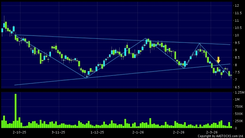 Triangle Breakout means the volatility of price movement is decreasing, stock price finally broke the bottom of triangle. A downward trend will start.(HK stocks quote is delayed for at least 15 mins.Short Selling Data as at 2026-03-16 16:25.)